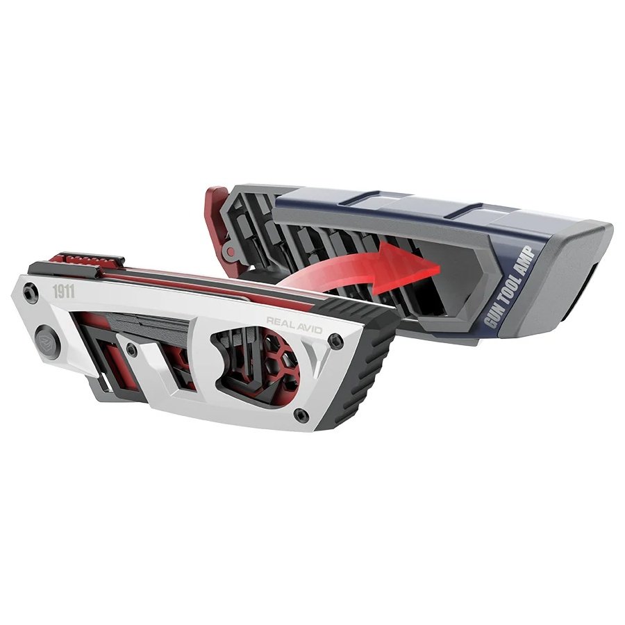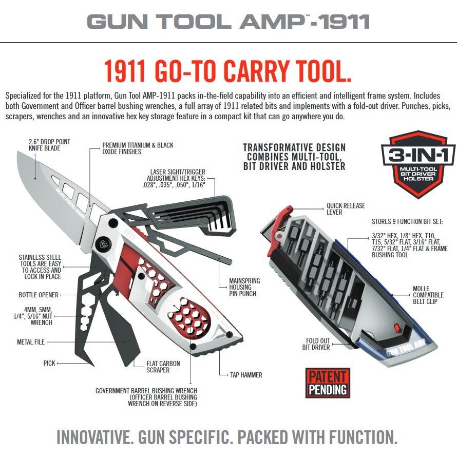 Specialized for the 1911 platform, Gun Tool AMP-1911 packs in-the-field capability into an efficient and intelligent frame system. Includes both Government and Officer barrel bushing wrenches, a full array of 1911 related bits and implements with a fold-out driver. Punches, picks, scrapers, wrenches and an innovative hex key storage feature in a compact kit that can go anywhere you do.