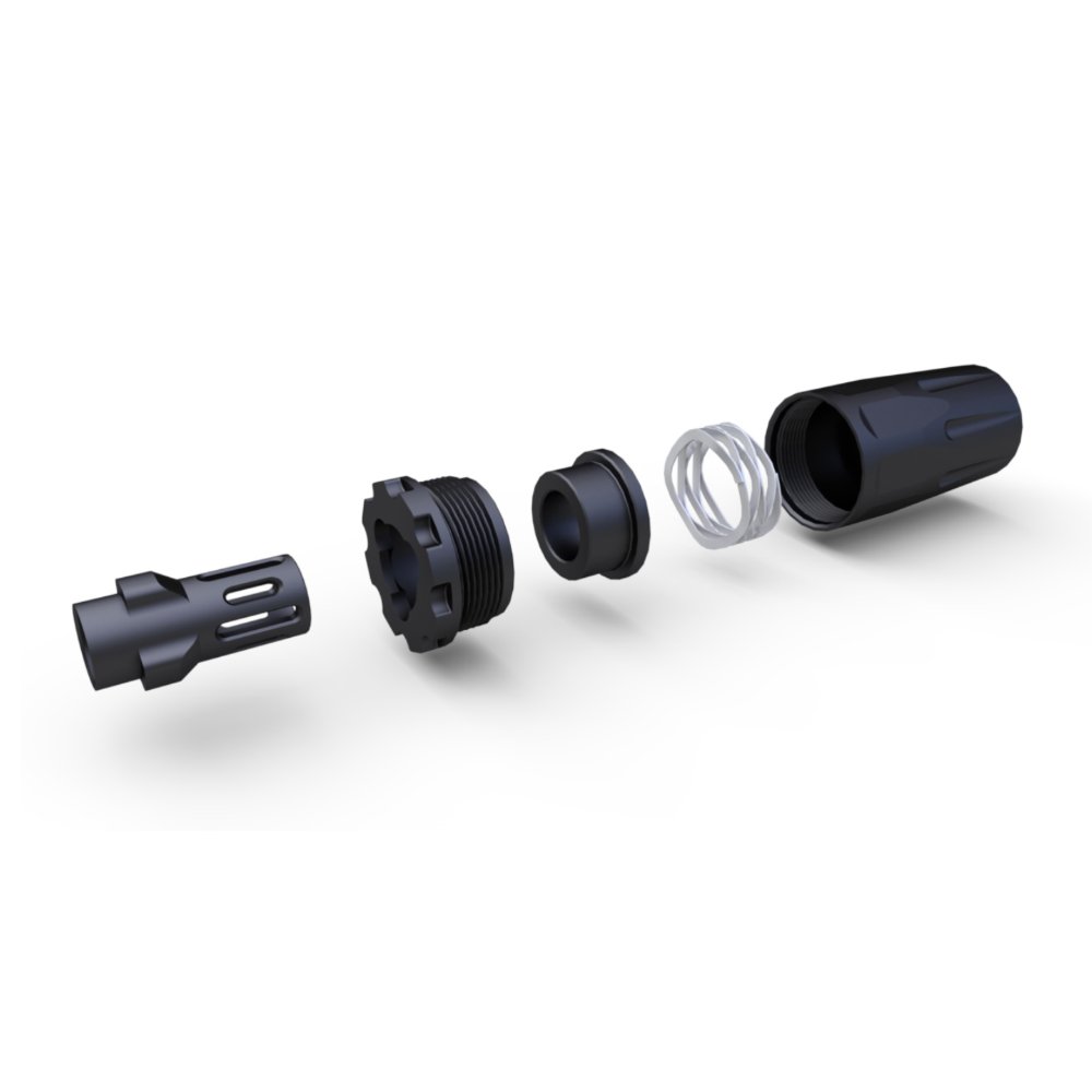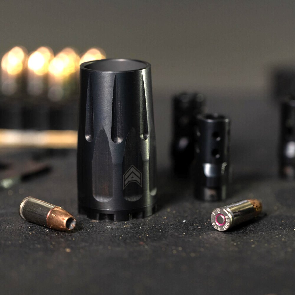 Angstadt Arms, Blastwave, Blast Diverter, 9MM, 3 Lug Attachment, 2.5" Length, 1.33" Diameter, 6.5oz Weight, Nitride Finish, Black
