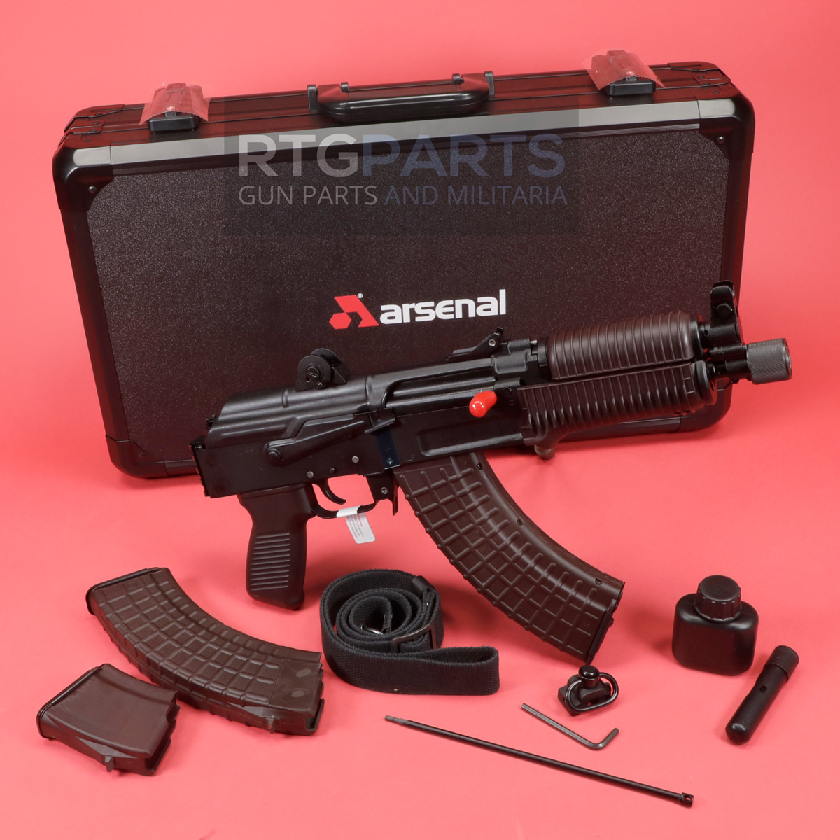 The Arsenal SAM7K-56 features the SAM7K 7.62x39mm milled receiver AK47 pistol with plum and black US made furniture, rear Picatinny rail, and QD sling swivel, scope rail, oil bottle, cleaning rod, and cleaning kit.This package includes the standard 10rd magazine with one additional 30rd Circle 10 M-47W waffle magazine. It's shipped in the Arsenal Custom Hard Case for SAM7K Series AK-47 Pistols. The case interior is lined with CNC machined hard foam custom designed to fit SAM7K series pistols, with cut outs for magazines (one 10rd and two 30rd), sling, cleaning kit, and oil bottle.