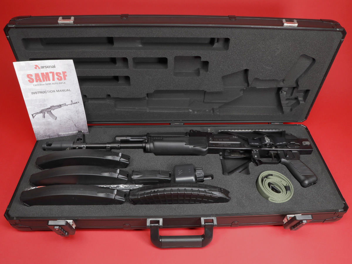 SAM7SF-86 /SAM7SF model 7.62x39mm caliber rifle, milled and forged receiver, enhanced FCG, chrome lined hammer forged barrel, 24x1.5mm muzzle right hand threads, muzzle brake, bayonet and accessory lugs, right-side folding tubular buttstock, black polymer pistol grip and handguards, stainless steel heat shield, ambidextrous safety lever, scope rail, sectional cleaning rod, black 10-round magazine, black 30rd magazine, SM-13 Scope Mount, sling, oil bottle, cleaning kit, and Arsenal Hard Case. Case comes with spaces for (4) 30rd mags so we fill it up with 3 additional ACU AK103 mags at no extra charge