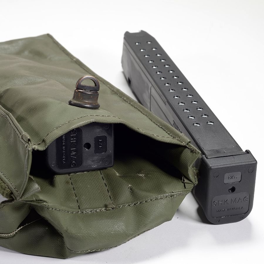 Belgian military production OD green PVC mag pouch. Measures approximately 4x10x1 Inch and stores multiples of most Subgun magazines and singles of most 30rd to 40rd mags.
