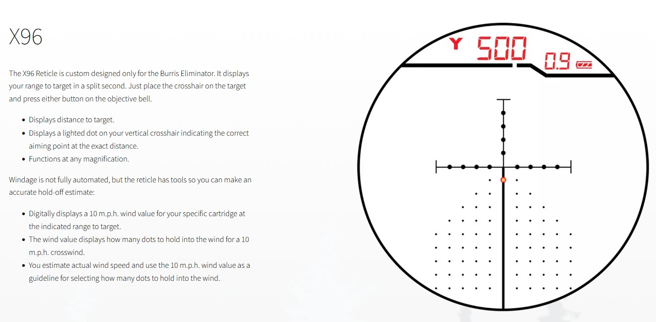 The new Eliminator 5 is the most innovative and effective hunting riflescope in the world. With the push of a button, the Eliminator 5 ranges and displays the distance to the target, instantly compensates and displays the exact aiming point and wind data all inside the scope for complete situational awareness. The Eliminator significantly increases your effectiveness as a hunter and eliminates the guesswork when seconds count. Use the BurrisConnect App to get the appropriate drop information to program your scope with your specific load data.
