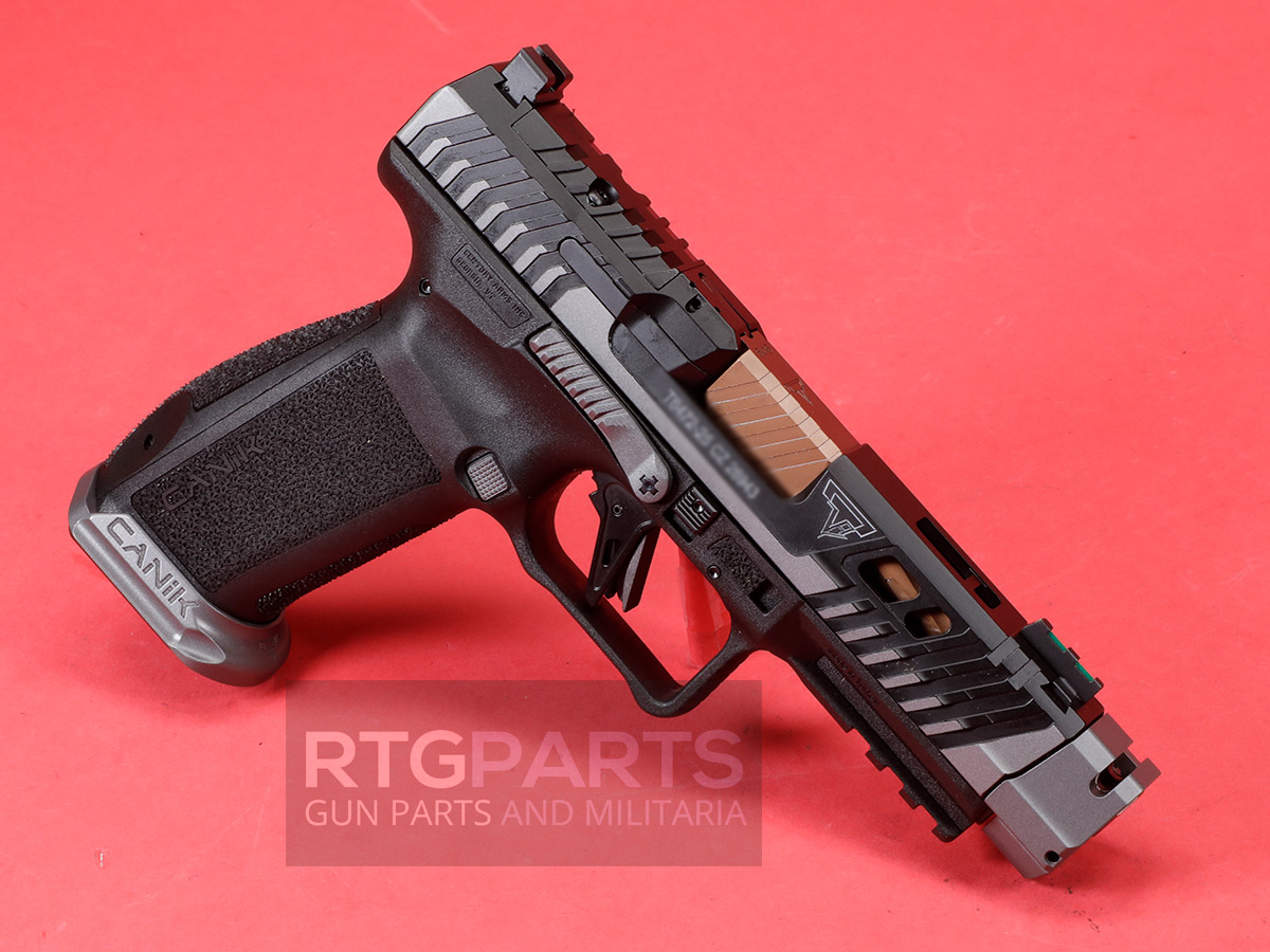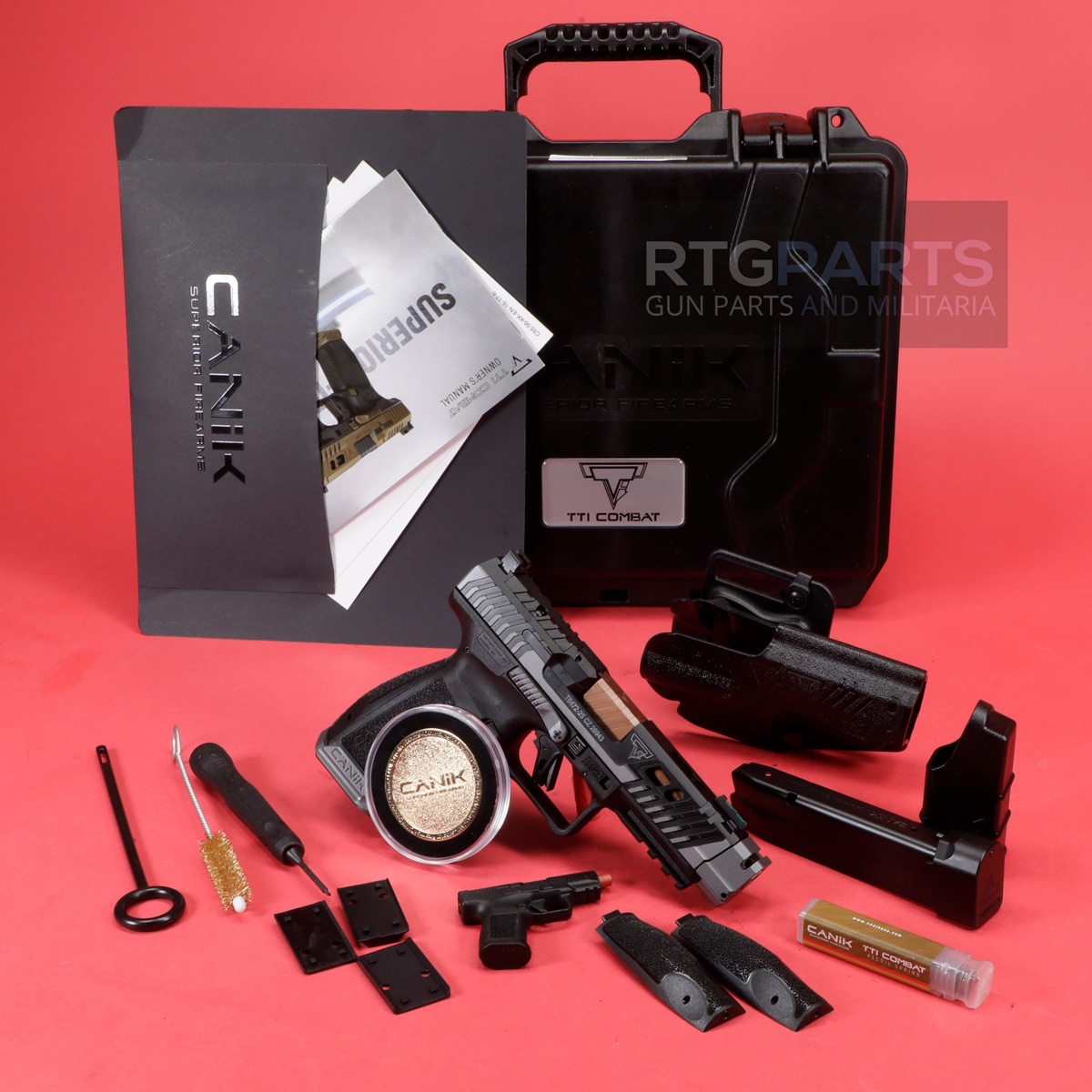 Taran Tactical Innovations and CANiK are proud to partner to bring you the CANiK TTI Combat. Built on a completely new polymer frame designed by Taran Butler, the TTI Combat brings a one-of-a-kind performance package to the CANiK lineup. This sleek design is built by the best, for the best, and includes all the features a world champion like Taran Butler needs for success. Both internally and externally, the TTI Combat delivers uniquely aggressive grip texturing, a ported and fluted barrel, the first CANiK compensator, a diamond cut, flat-faces, 90 degree break trigger. TTI +3 magazine base pads, a newly designed slide release, an optics cut that even allows for a low profile seating of the MECANIK line of optics as well as the Trijicon SRO and many others, a custom holster, and travel hard case. To finish off this collectable package Canik has included a handsome collaboration coin to commemorate our lasting partnership. This partnership has created a truly superior firearms!