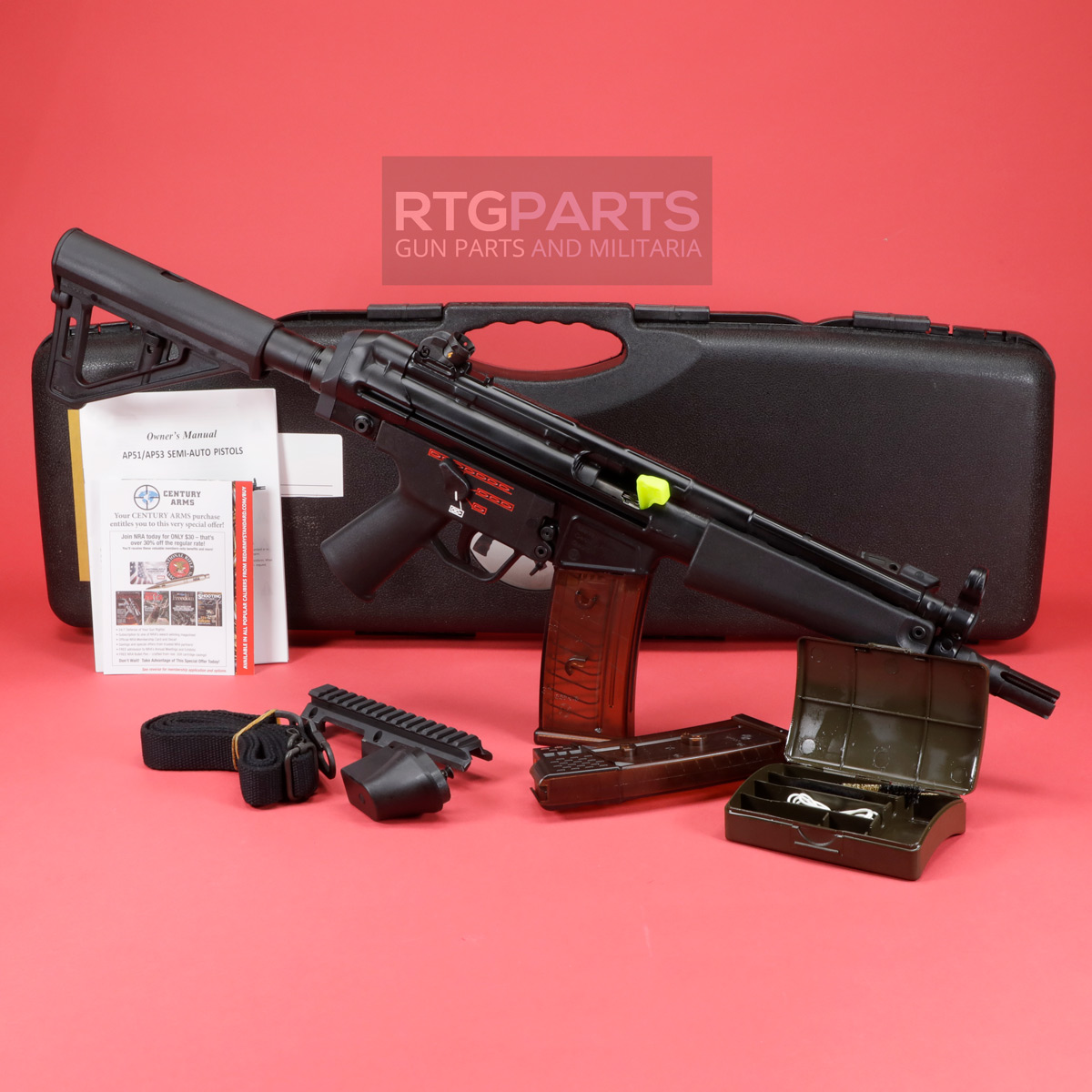The Century Arms AP 53 is based on the iconic HK53 and is chambered in 5.56x45mm, with a 30 round HK 33 pattern polymer magazine, an overall length of 22.3 inches, a width of 2.2 inches, a height of 10 inches, a cold hammer forged barrel length of 8.3 inches and an unloaded weight of 7.2lbs (3.3kg). The AP 53 is equipped with a Navy style assembly with an ambidextrous selector, MP5 compatible wide handguard, standard HK33 trigger set-up and 4 prong flash hider.