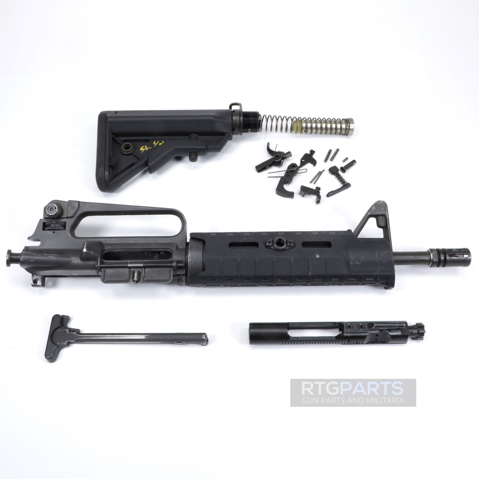 This is a colt 733 A2 commando parts kit with 11" barrel. This kit is missing it's grip, grip screw/wash, selector and some small pins/springs. The barrel, upper receiver, bolt and charging handle are all Colt, as are all the remaining small parts. The stock assembly (buttstock, tube, end plate) and handguard were replaced by a PD so they could use lights and QD slings, and the front sight blade was replaced with a tritium version. Other than those parts, this is a nice colt kit.