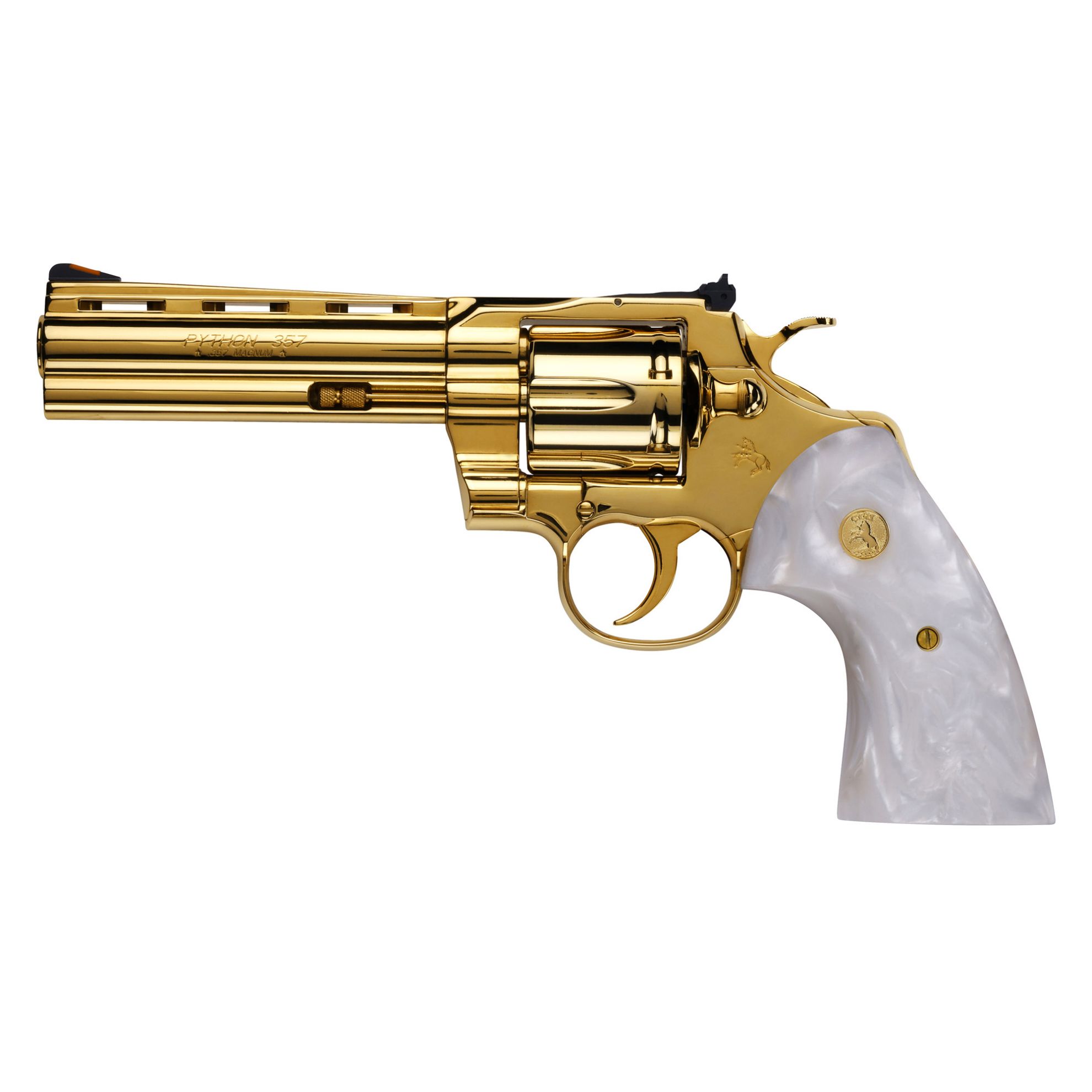 Colt's Manufacturing, Python, Revolver, Double/Single Action, 357 Magnum, 5", 24K Gold Frame, 24K Gold Parts, Pearlite Creme Grips With Gold Colt Emblem, 6 Rounds, 1:14, Stainless Steel, Blade Front/Adjustable Rear, Premium Black And Gold Wooden Case With Certificate Of Authenticity