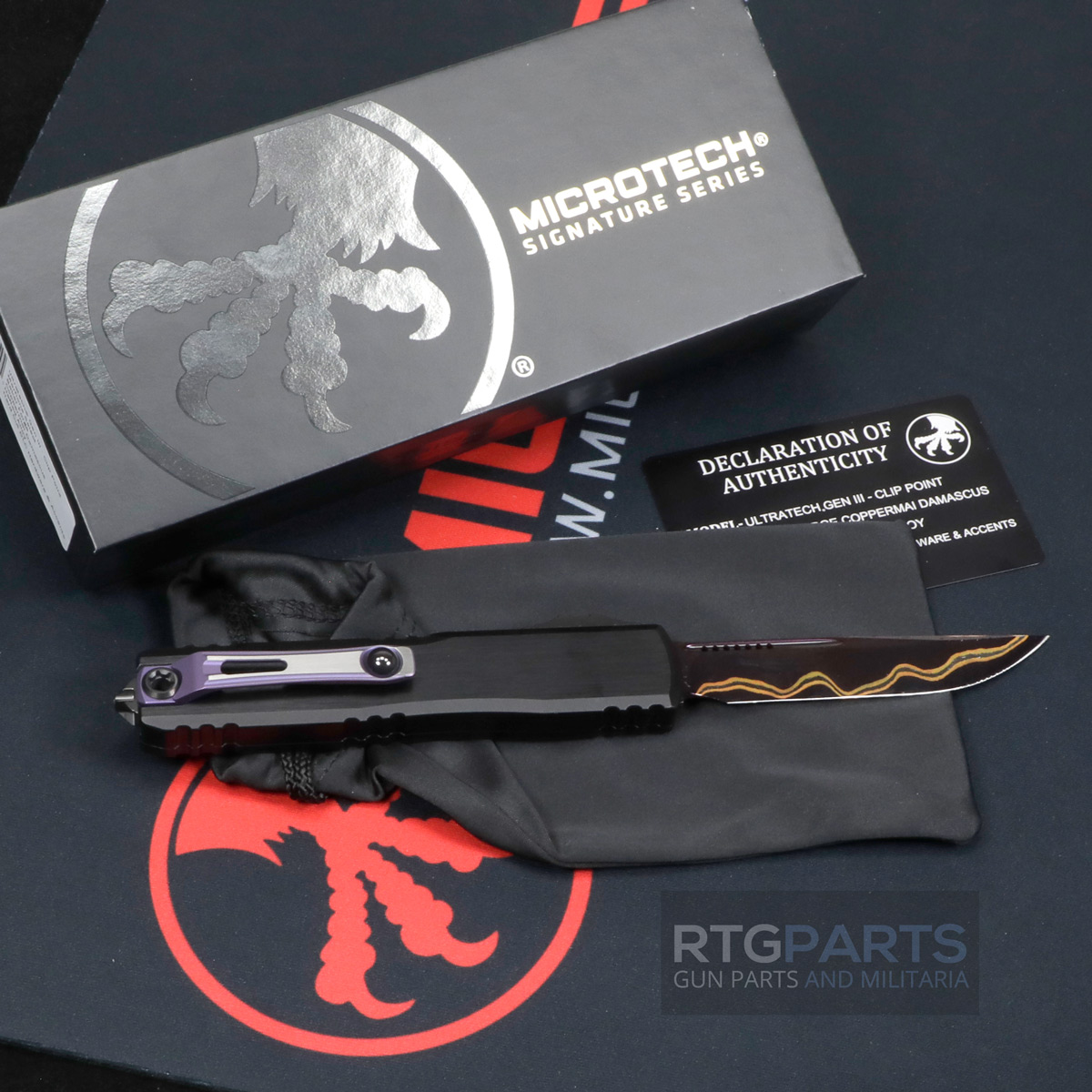 Microtech Ultratech Gen III ZBP, Marfione Select, Bake Forge, Coppermai Damascus, Hefted Alloy, Hard Cut DLC Hardware & Purple Titanium Accents, Made in the USA, 1121-16MS3