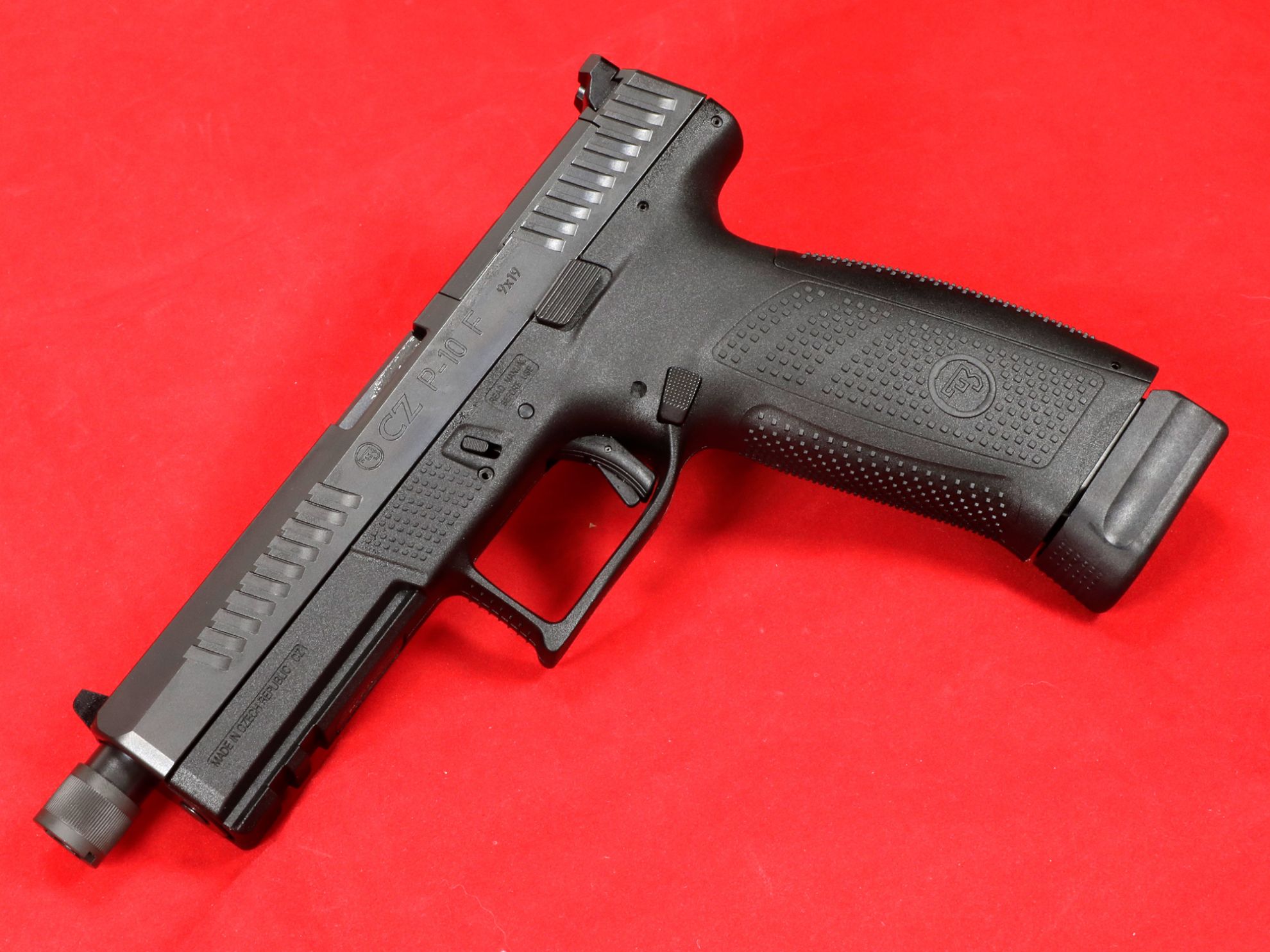CZ, P-10 F Suppressor and Optic Ready, Striker Fired, Semi-automatic, Polymer Frame Pistol, Compact, 9MM, 5.1" Threaded Barrel, 1/2X28, Nitride Slide Finish, Black, 3 Interchangeable Backstraps, High Fixed Sights, Optic Ready, Integrated Trigger Safety, 21 Rounds, 2 Magazines