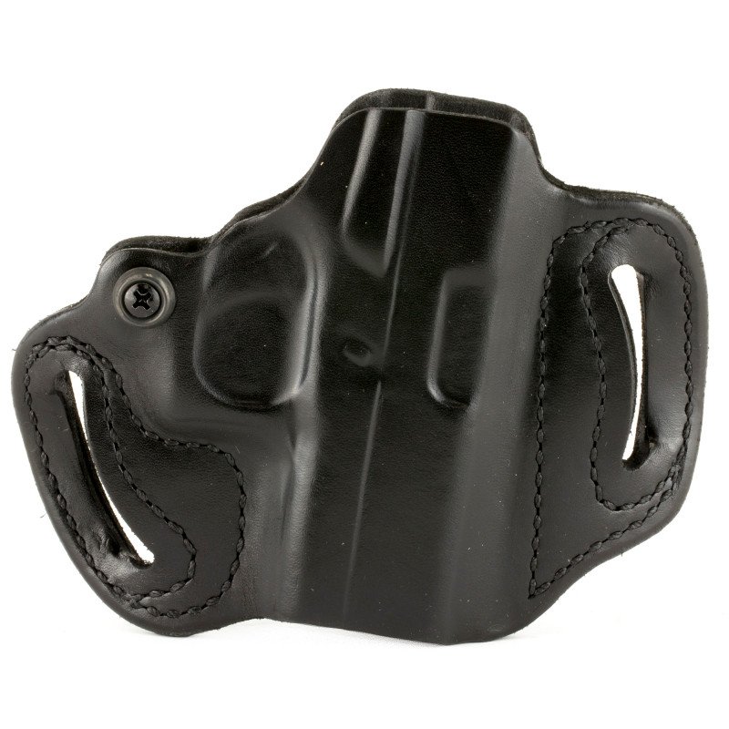 The Mini Slide(R) is a premium saddle leather, double seams and a highly detailed molded fit, make this exposed muzzle, tight fitting, two-slot holster a great choice for your favorite pistol. It features an adjustable-tension device. Available in black or tan unlined leather. Belt slots are 1 3/4" wide.