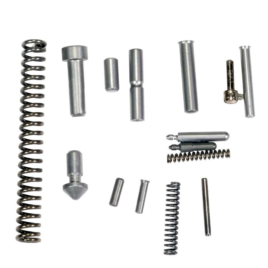 Includes Mainspring Cap, Mainspring Housing Pin Retainer, Hammer Strut Pin, Hammer Pin, Sear Pin, Mainspring Cap Pin, Magazine Catch Lock, Safety Lock Plunger Assembly, Barrel Link Pin, Ejector Pin, Mainspring Housing Pin, 19# Mainspring, Mag Catch Spring. Every pin and spring needed to rebuild or complete a 1911 style frame.