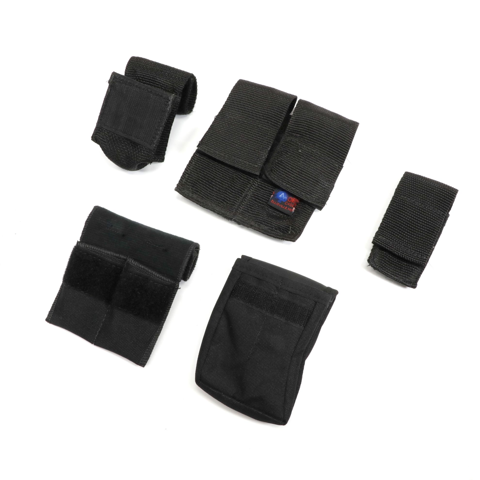 FIVE SMALL MAG POUCHES. 3x2-Cell and two 1-Cell pistol sized mag pouches. These are used by in good condition.