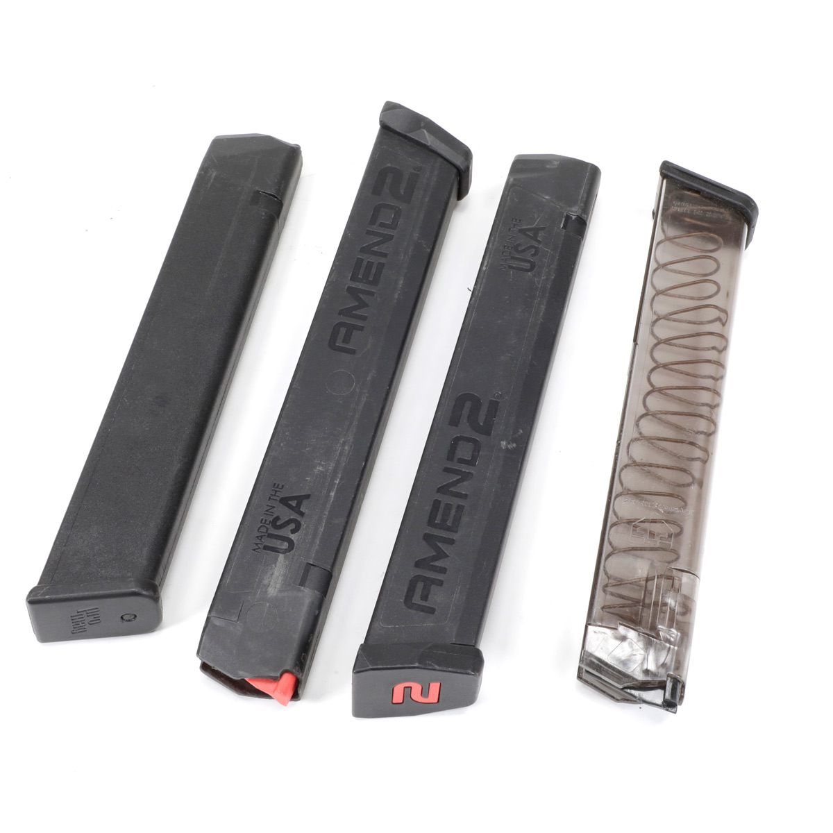 FOUR GLOCK 9MM EXTENDED MAGAZINES. All US made. One ETS 30rd, two Amend2nd 34rd and one metal lined promag 30rd. Mags are used in good condition.