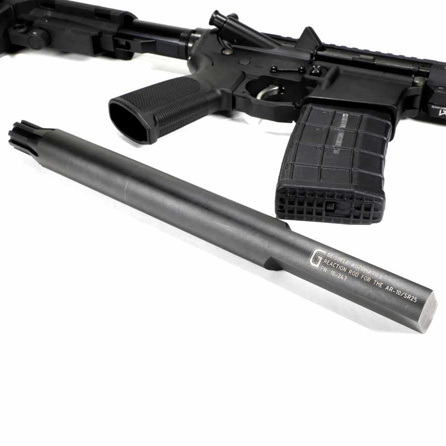 The AR-10/SR25 Reaction Rod makes the removal and installation of barrels, flash hiders, gas blocks and hand guards much easier and simpler. The Reaction Rod is designed to be gripped in a bench vise so that the rod is either horizontal or vertical. The upper receiver is then slid onto the rod and the rod's integral splines enter the barrel extension and secure the barrel extension from turning. This allows all the torque from barrel nut wrenches to go directly into the barrel extension. In contrast, receiver vise blocks transmit the turning force into the aluminum receiver, a good part of which passes through the small, easily distorted receiver index pin. With the Geissele Reaction Rod, marring of an upper receiver's finish by gripping and twisting inside vise blocks is eliminated and so is the need to remove sights and mounts from the receiver's M1913 rail.