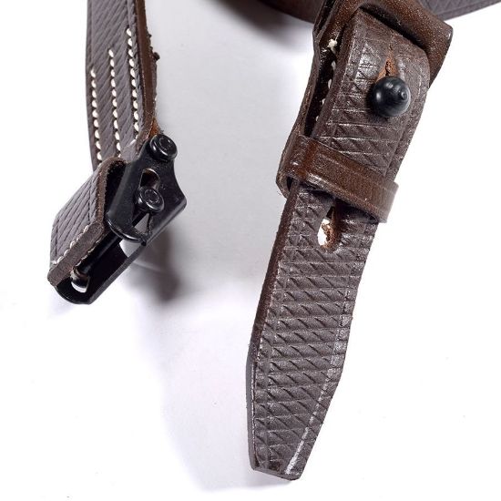 WWII style K98 leather sling new. Great for your K98, Yugo Mauser or STG44. Fits many other weapons. 1 Inch wide and 47 inches long. Made of Buffalo leather. Very strong and durable, a great reproduction of a WWII sling.