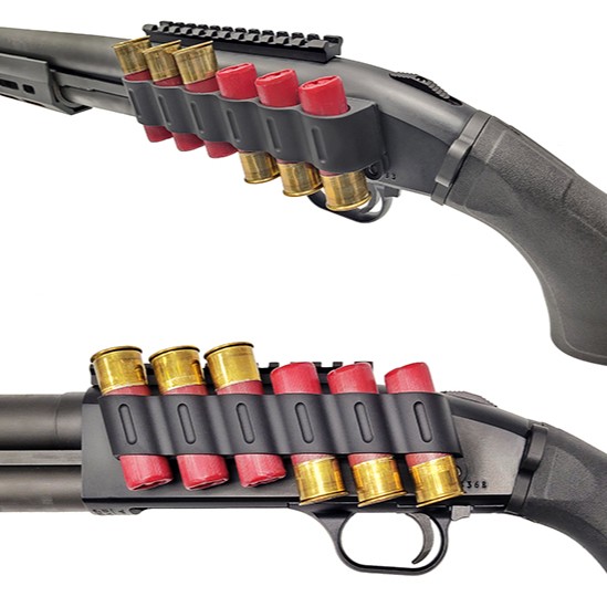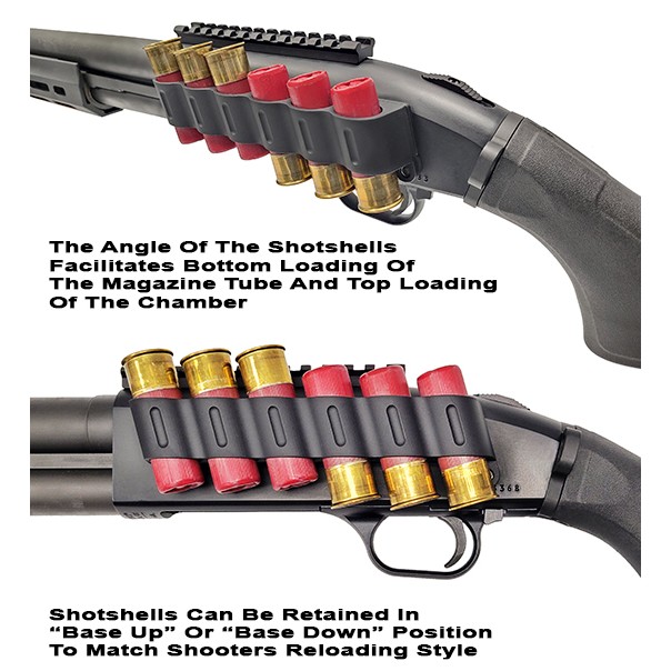 - With the Mossberg 500 Side Saddle Shell Holder, shotshells can be retained in base up or base down position depending on shooters style of reloading.