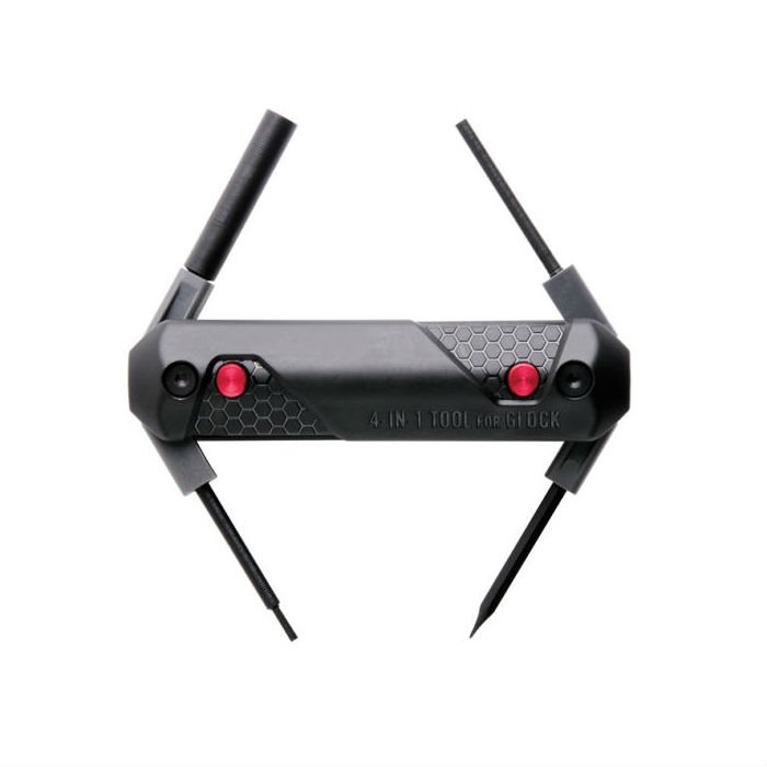 Folding, push button armorer's 4-IN-1 multi-tool for Glock. Sleek, ergonomic, packed with function. In every way a thoroughly modern armorer’s tool for Glock owners. 4 different tools store inside the handle and each snaps open and locks in place with the push of a button. Remove pins for disassembly, change out front sights, remove slide lock spring and locking block and adjust aftermarket rear sights. Smart, precise, advanced...just like your Glock.