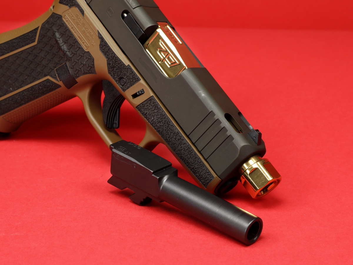 Custom Distressed green slide with custom blended FDE Frame. Hybrid Laser stipple, Ported slide, gold threaded and black standard barrels, optic cut for RMSc foot print.