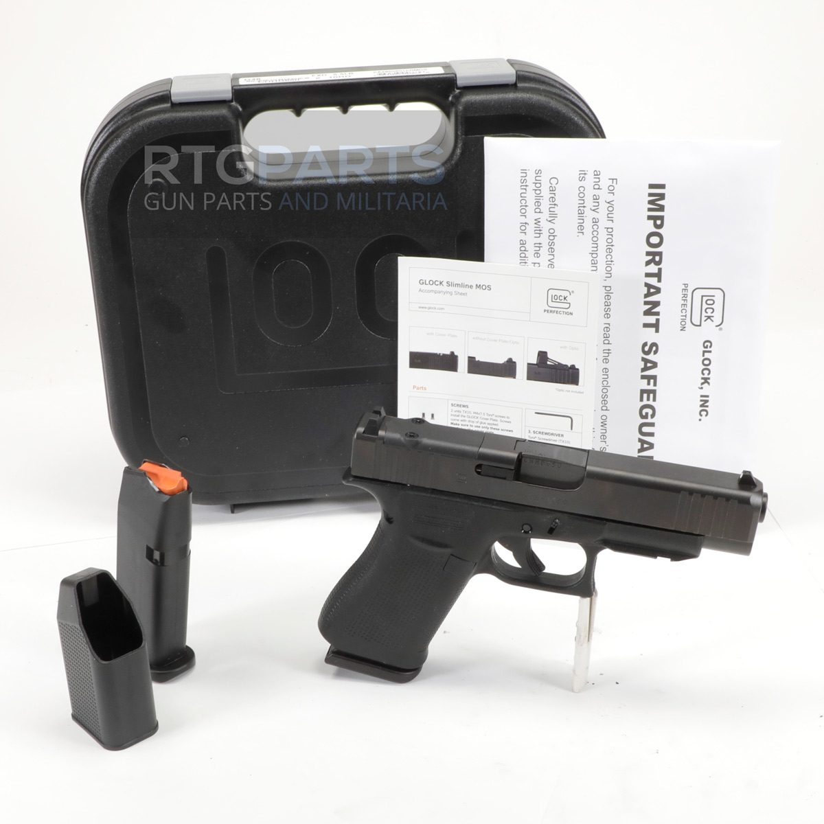 GLOCK, 48 M.O.S., Striker Fired, Semi-automatic, Polymer Frame Pistol, Compact, 9MM, 4.17" Barrel, Glock Marksman Barrel, nDLC Finish, Black, No Finger Grooves, Fixed Sights, Modular Optic System, 10 Rounds, 2 Magazines