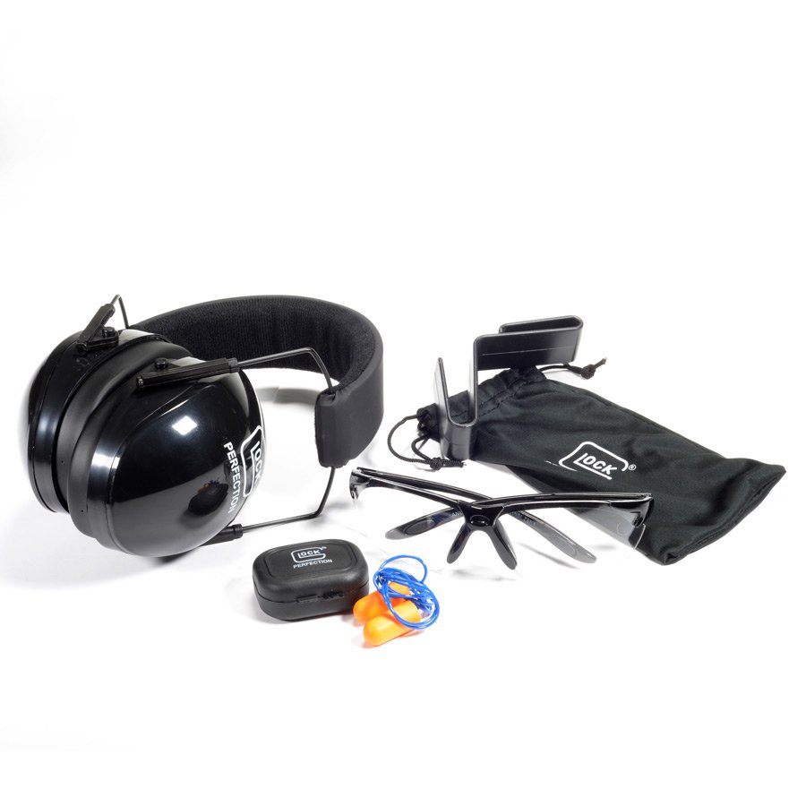 Glock, Hearing Protection Ear Muffs, Hearing Protection Ear Muff Holder With Integrated Belt Clip, Foam Ear Plugs With Connection Tether, GLOCK Ear Plug Case, Shooter/Safety Glasses, GLOCK Cloth Pouch, Black