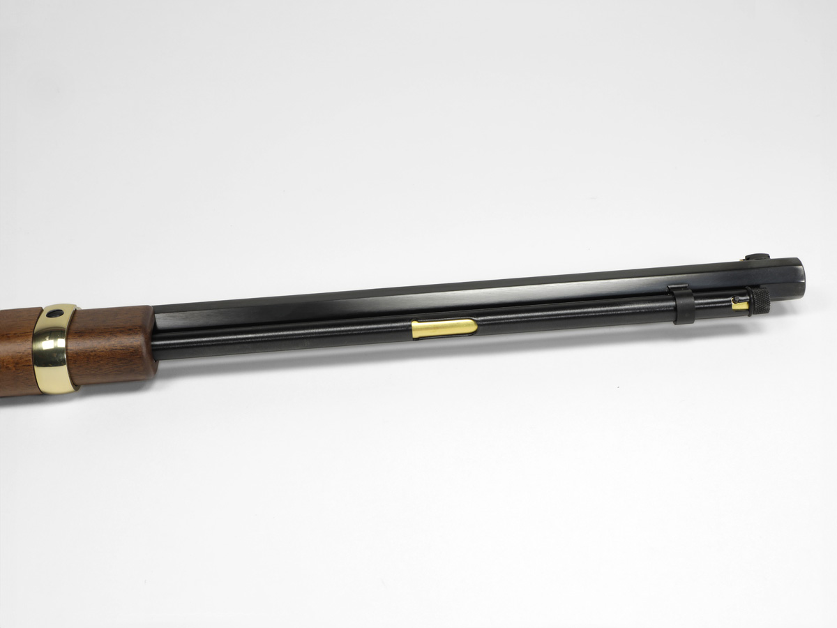 Finish: Brasslite receiver, brass buttplate and blued barrel and and Brasslite barrel band