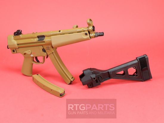 The SP5 was developed by Heckler & Koch as a semiautomatic, civilian sporting pistol that matches the look and feel of the legendary MP5 submachine gun. Designed and manufactured to meet the definition of a civilian pistol, the SP5 is loaded with authentic features, like a Navy barrel with threaded tri-lug adaptor, paddle magazine release, and fluted chamber.