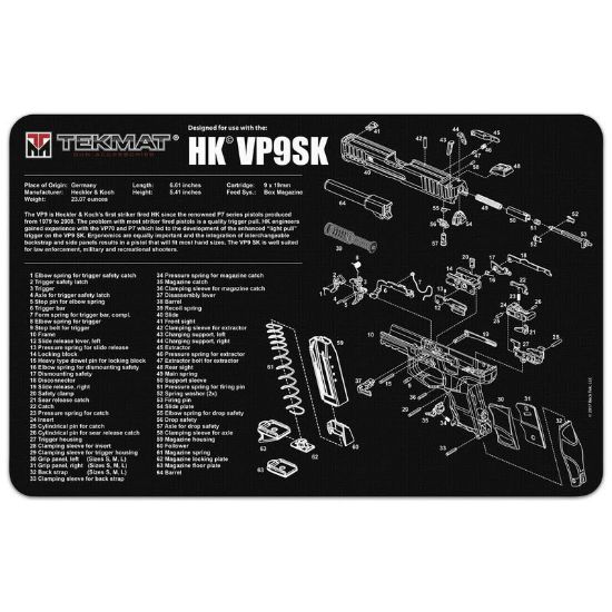 HK VP9SK cleaning and repair mat by TekMat. The perfect mat for your VP9SK. Have fun and learn while you work on your favorite handgun. The soft top protects your gun from scratches while the neoprene rubber backing protects your work surface from chemicals while keeping everything in place.
