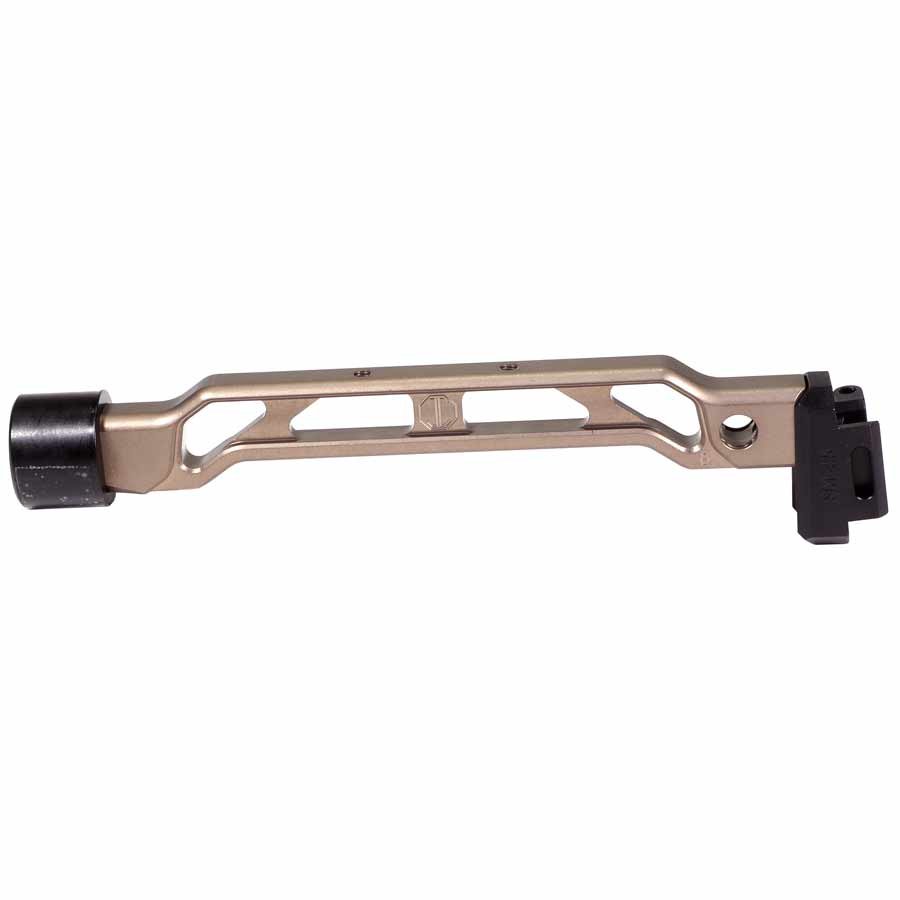 This version of the SM stock/brace adapter is specifically made for 4.5mm pin folding stocks. 4.5mm trunnions can be found in the SLR 104/106/107 UR/CR/FR. Cheek wield is adjustable by moving the stock/brace up or down on the adapter.