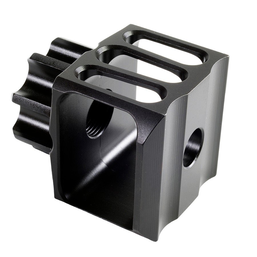 The LAF (Loud And Flashy) is a LARGE single chamber muzzle brake designed to enhance sound and flash, while reducing recoil and muzzle rise!