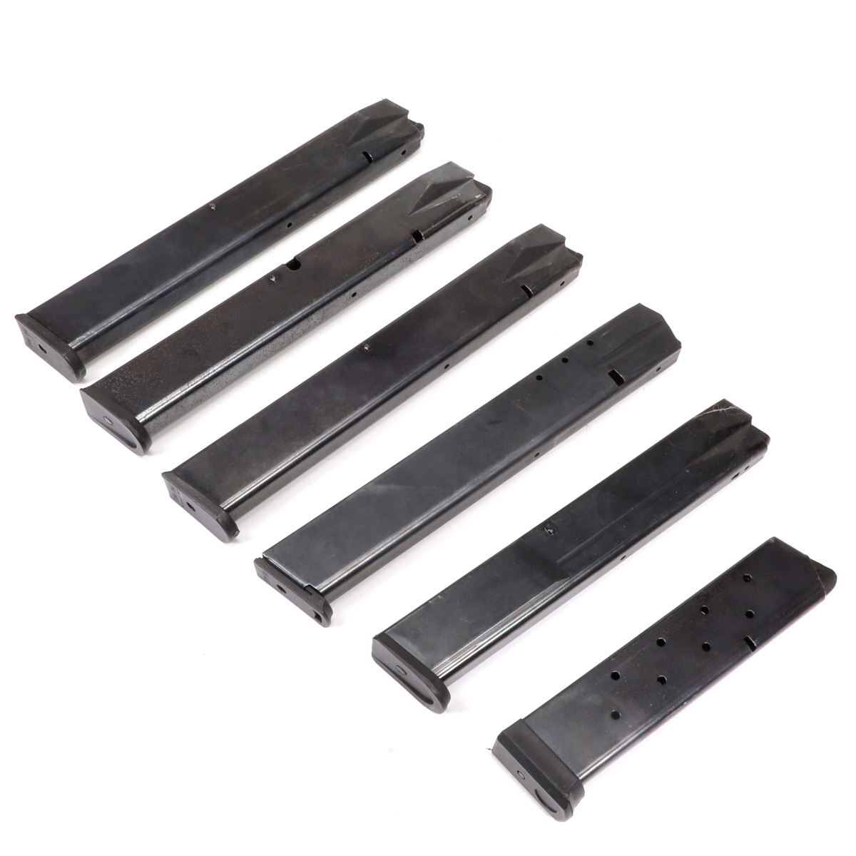 LOT OF 6 EXTENDED CAPACITY PROMAG PISTOL MAGAZINES. Unidentified models. All are in good working order.