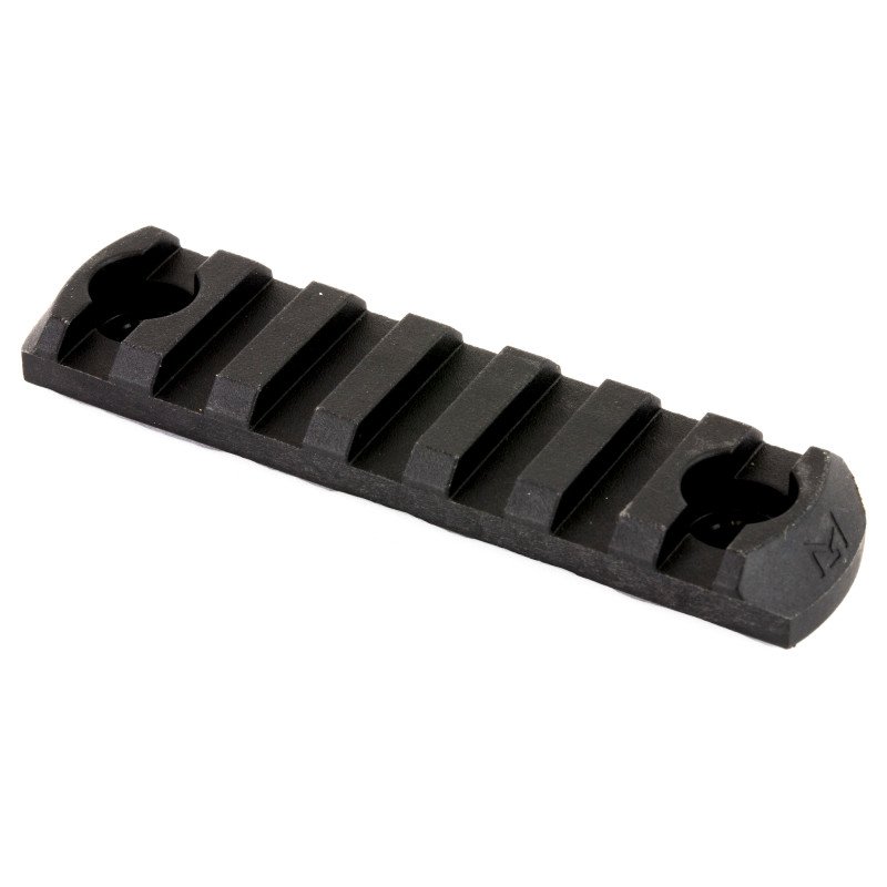 Designed for use with all M-LOK compatible Hand Guards and Forends, M-LOK Polymer Rail Sections provide a cost effective method of attaching various 1913 Picatinny spec rail-mounted accessories such as lights, vertical grips, etc. Injection molded from a proprietary reinforced composite for enhanced strength and durability while remaining lightweight, Rail Sections also feature beveled ends to reduce snagging and eliminate sharp corners and edges. All hardware necessary for attachment directly to M-LOK Slots on either aluminum or polymer hand guards and forends is included. 7 Slots, max overall length of 3.3 in.