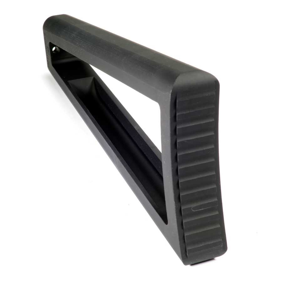 Made of 6061 aluminum that is bead blasted and anodizied black, the stock weighs 12.4 ounces, and with a hinge installed weighs 14.8 and has the exact length of a true Russian or Bulgarian sidefolder stock. The rear of the stock has a machined rib pattern to give a good grip on the shoulder, and with the use of a hinge it can be configured to fold left or right.