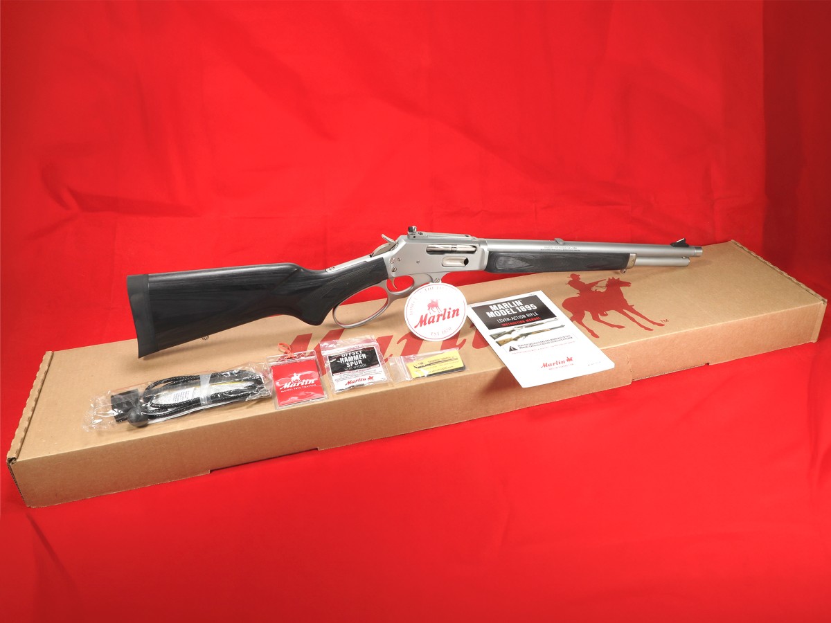 Marlin Firearms, 1895 Trapper, Large Loop, Lever Action Rifle, 45-70 Government, 16.5" Threaded Barrel, 11/16X24 Pattern, Satin Finish, Silver, Black Laminate Stock and Forend, Adjustable Skinner Sights, Crossbolt Safety, 5 Rounds, Right Hand