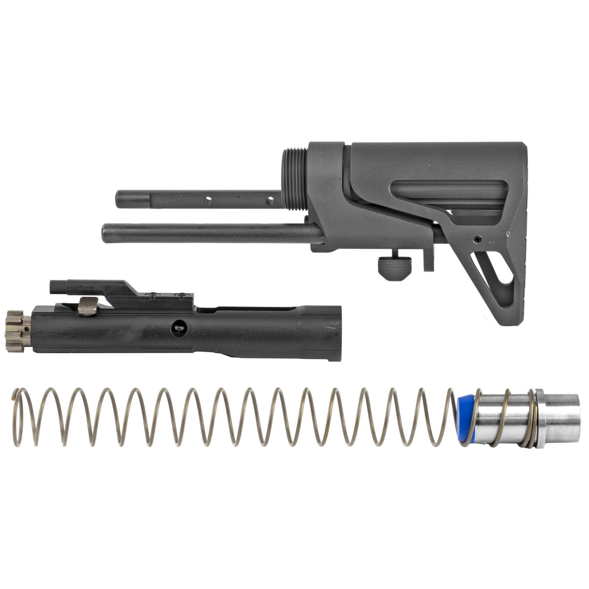 The Maxim Defense SCW Stock is built for comfort and durability for real-world use. No buttons to push, just pull the stock to deploy. At its most collapsed position, this SCW stock only adds 4.0" to your AR-15. At full extension, the Maxim SCW stock reaches 8.8 inches. With 5 total positions you can adjust for maximum comfort and multiple scenarios. Rapid deployment, purpose driven materials, and the functionality you need, the Maxim Defense SCW Stock is simply the shortest, most thought out, versatile, and durable SCW stock on the market. This complete kit comes with the SCW stock assembly, a proprietary standard weight buffer and buffer srping, and a shortened bolt carrier group tuned for reliable function with the stock system. Not compatbile with standard AR-15 buffer tube assembly components.