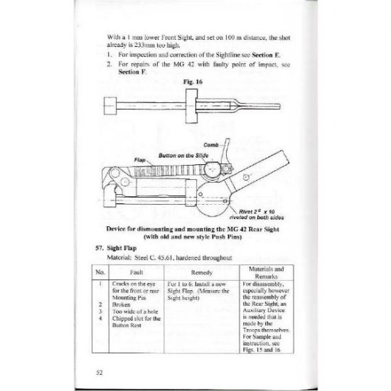 Finally an MG42 armorers repair manual in English! This 1944 dated manual states that it is current to 4/1/1944 with all updates and revisions to that date. It's the only true German MG42 armorer's manual I've seen. This contains dimension drawings for making pressure plate, extractor, sight-line and head space gauges, other home-made tools, how to perform repairs and inspections, how to reinforce the stocks (including making and installing the not-often-seen straps on the corners of the wood stocks), and has many pages of tables on troubleshooting. Sighting in is explained in depth, and if it can go wrong, from cracks behind the Cam Piece to worn out parts, it's in here. It also contains 7 pages on the operation and disassembly of the MG42 Lafette, and has a few pages of tables showing pin, rivet and coil spring dimensions.