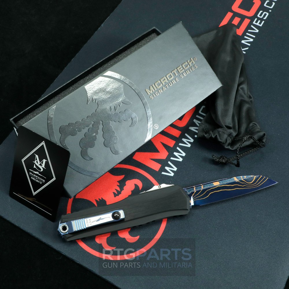 Microtech, Marfione Select, Cypher II, S/E Wharncliffe OTF, Automatic Knife, Blued Baker Forge Coppermai Damascus, Hefted Alloy, Hard Cut W/ Blue Titanium Accents and Tritium Button Insert, Made in the USA, 1241-16MS1