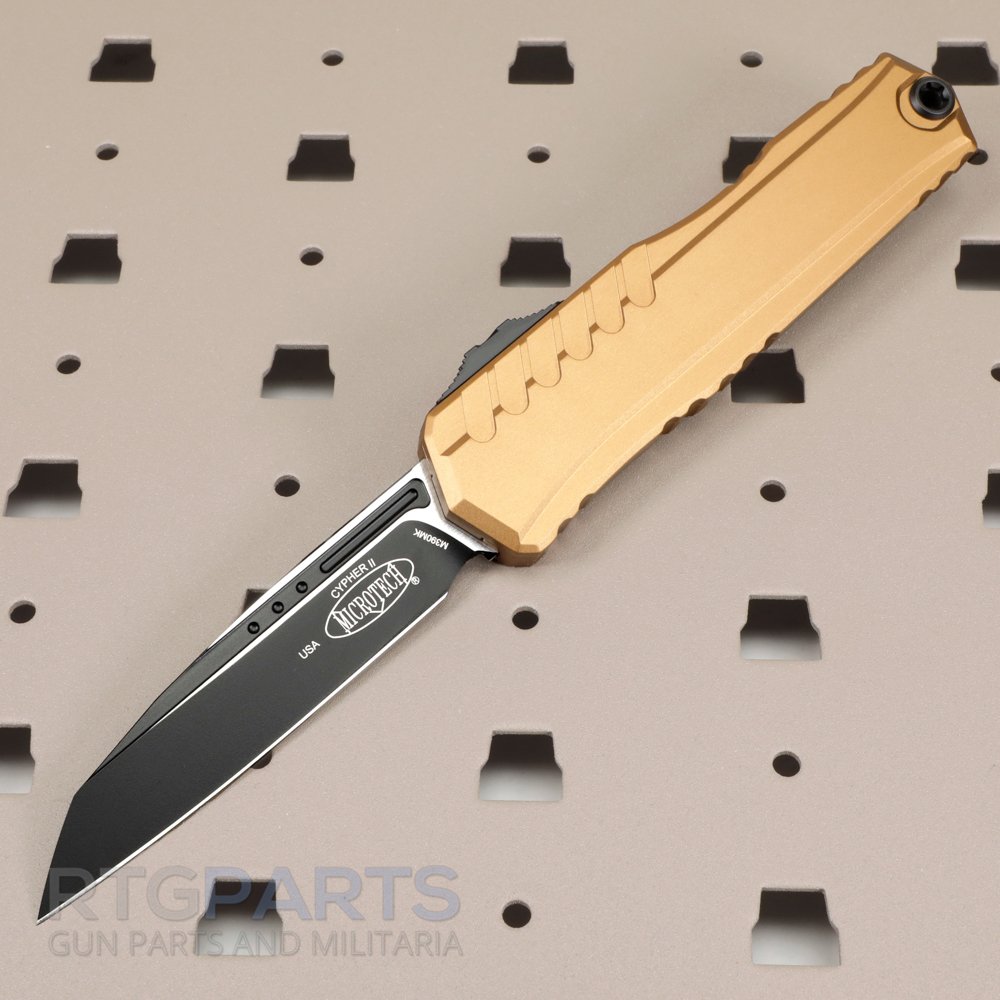 Microtech Cypher II, S/E OTF, Automatic Knife, Tan, Wharncliffe, 3.5 Inch, Black, 100% Made in the USA, 1241-1TA