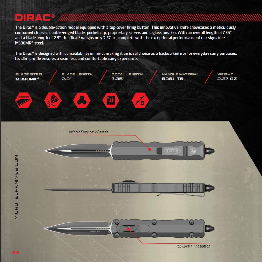 The Dirac is our first dual action knife with a cover firing slider. We designed an updated ergonomic chassis with curved lines similar to the HALO for a slightly different feel compared to our other handles. We researched this particular OTF design and applied our signature ultra-high tolerance Microtech features such as proprietary hardware, innovative internal mechanism, and glass breaker. With an overall length of 7.25 inches, the Dirac is just right for an everyday knife.