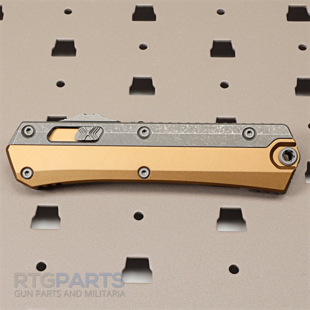 Named for an ancient Greek snake god, the Glykon is the first Microtech to feature the tri-sided button. This makes it a top-slide OTF as well as a side-firing model that is completely ambidextrous. All you need to do is switch the pocket clip over to the other side with a huge Torx bit and you're good to go. It's one of the few Microtechs to use Torx screw construction allowing for adjustments at home. It also features titanium accents and overlays on the frame that are easy to remove and customize if that's your thing. Constantly innovating, Microtech has a definite winner here with the Glykon.