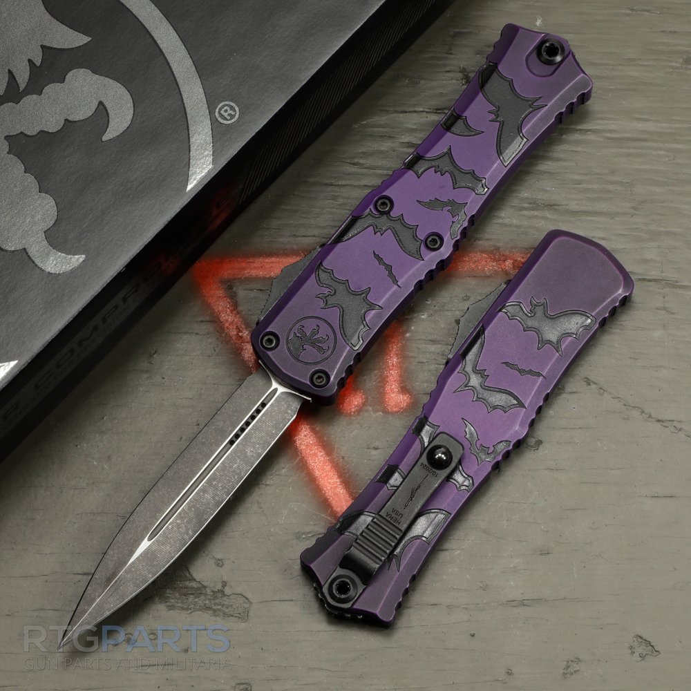 Microtech Hera II Mini, OTF, Automatic Knife, Purple, Halloween Bats, Limited Edition, Signature Series, 3 Inch, Double Edge, Dagger, Apocalyptic, Titanium Clip, 100% Made in the USA, 1702M-1HWBAS