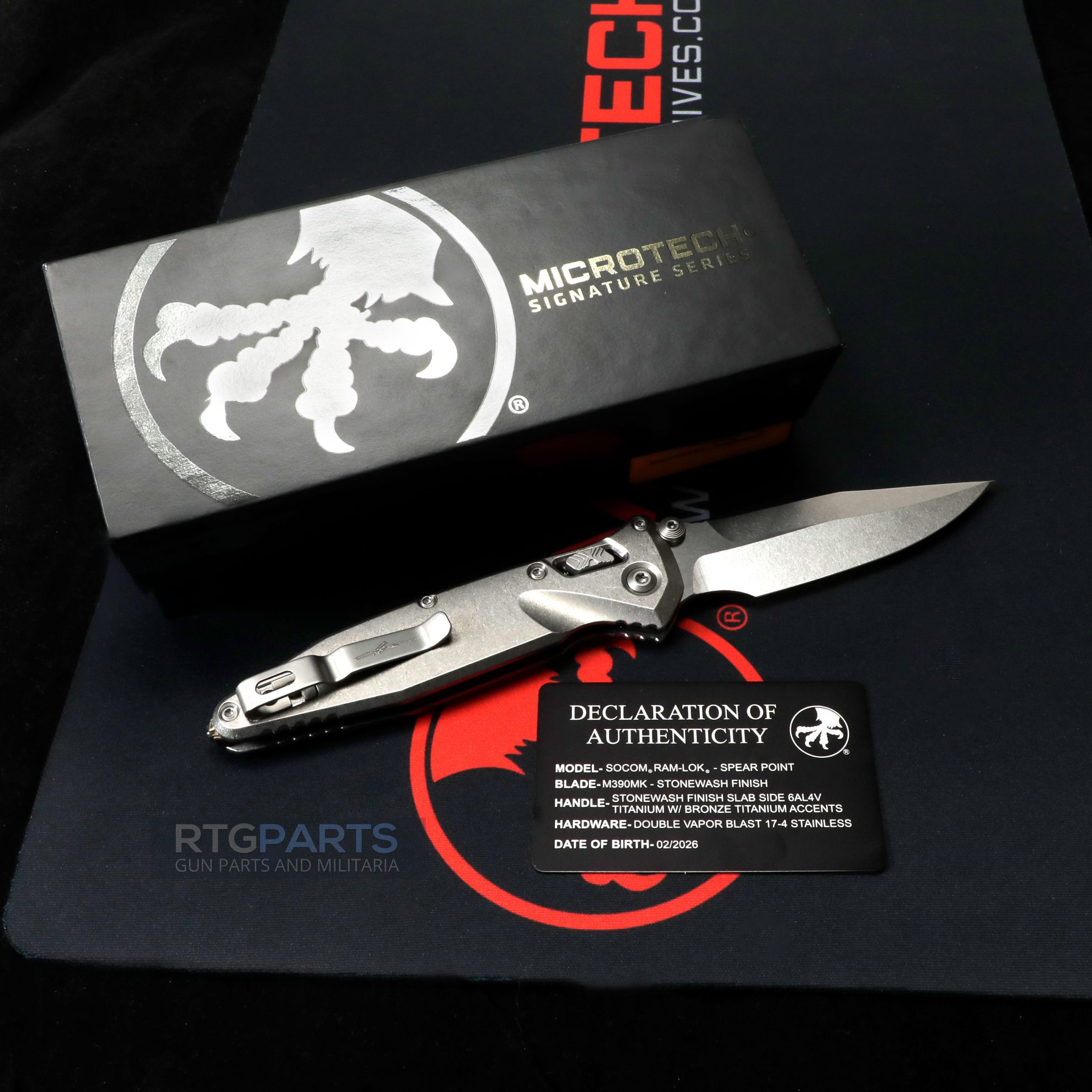 Microtech, Marfione Select, Socom RAM-LOK, 4" Spear Point, Manual Folding Knife, M390, Stonewash, Titanium Slab Side with Bronze Accents, Made in the USA, 160RLS-10SMS2