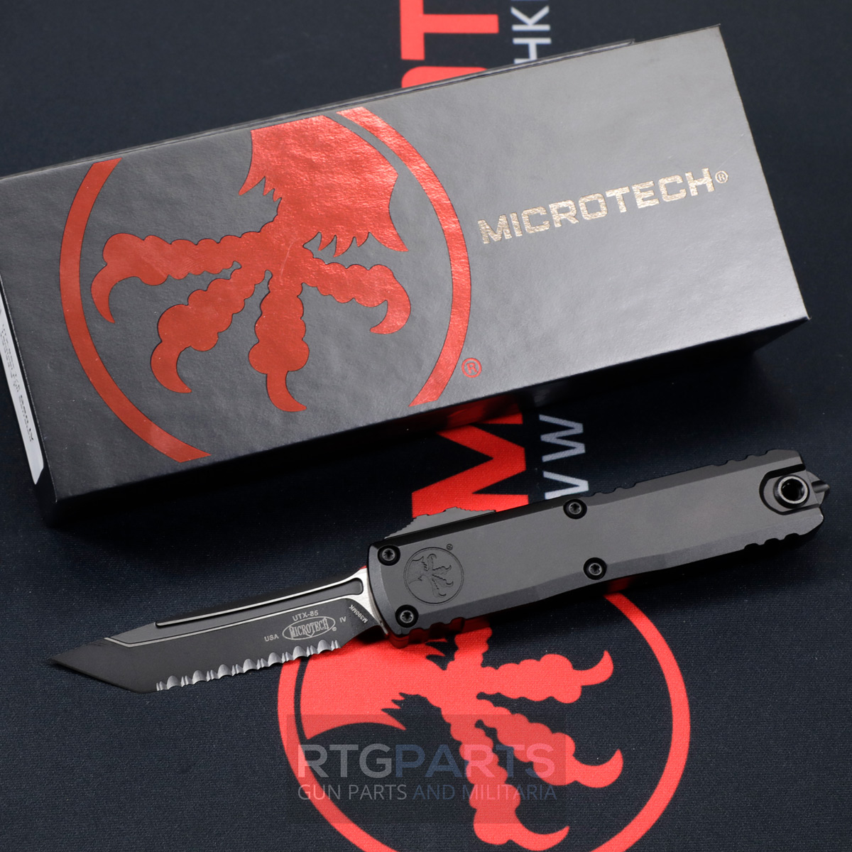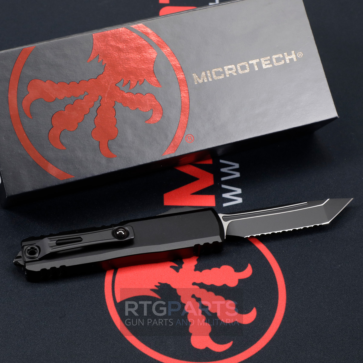Microtech UTX-85 Gen IV, D/E OTF, Automatic Knife, Black (3.125 Inch), M390, Tanto Edge (T/E), Full Serrated Tactical Black, Made in the USA, 12334-3T