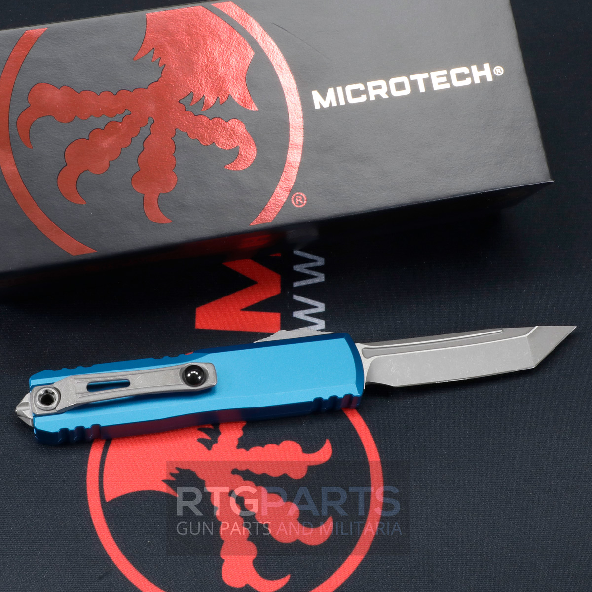 Microtech UTX-85 Gen IV, D/E OTF, Automatic Knife, Blue (3.125 Inch), M390, Tanto Edge (T/E), Apocalyptic, Made in the USA, 12334-10APBL