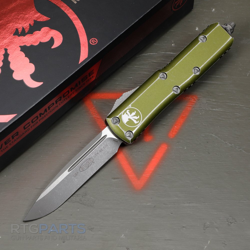Microtech UTX-85 S/E OTF Automatic Knife, Distressed OD Green, 3.125 Inch, Apocalyptic Blade, OTF, Drop Point, Glass Break, EDC Knife, 231-10DOD