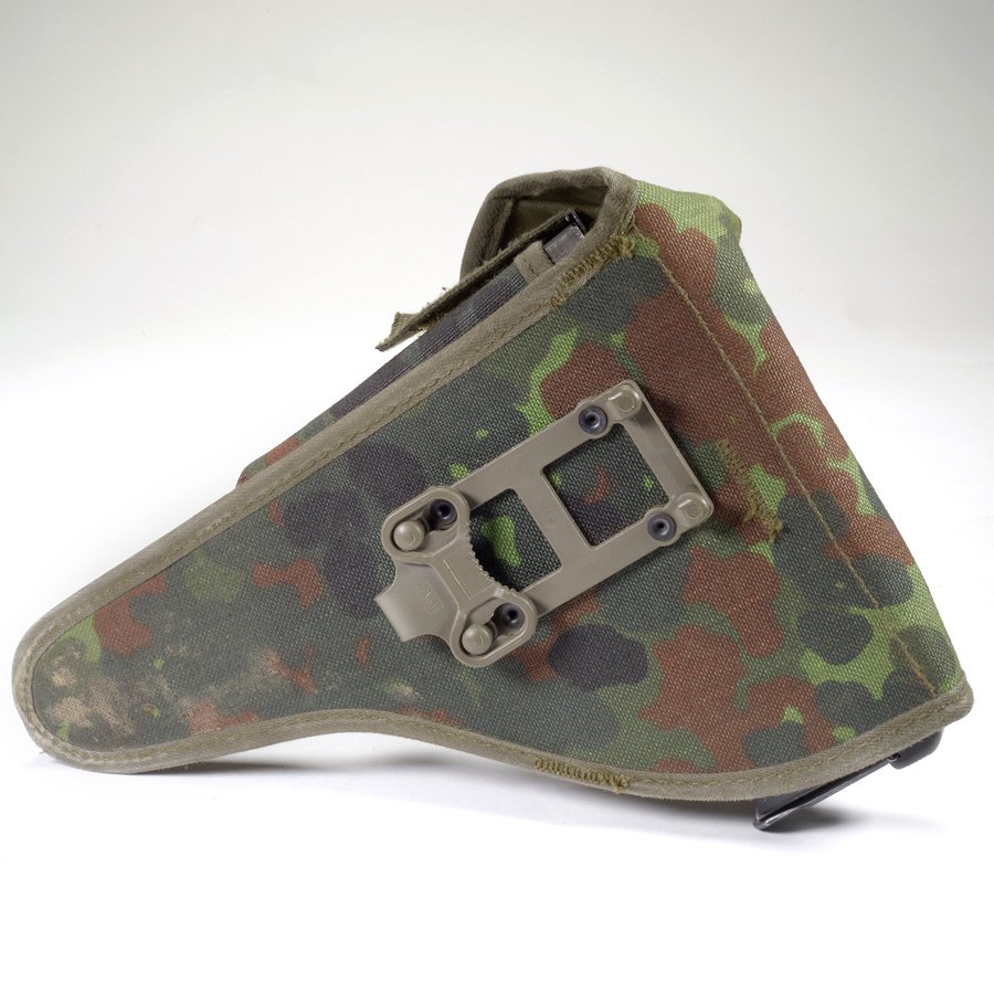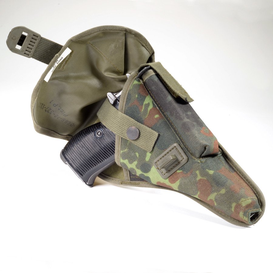 P1/P38 flectarn camo holster used. This was the last Walther P1 holster issued to German forces and was designed to work with the latest German web gear. Each holster has room for your Walther P1, P38 or P4 pistol plus one extra magazine. Limited supply. Surplus from the German Army, good to very-good condition.
