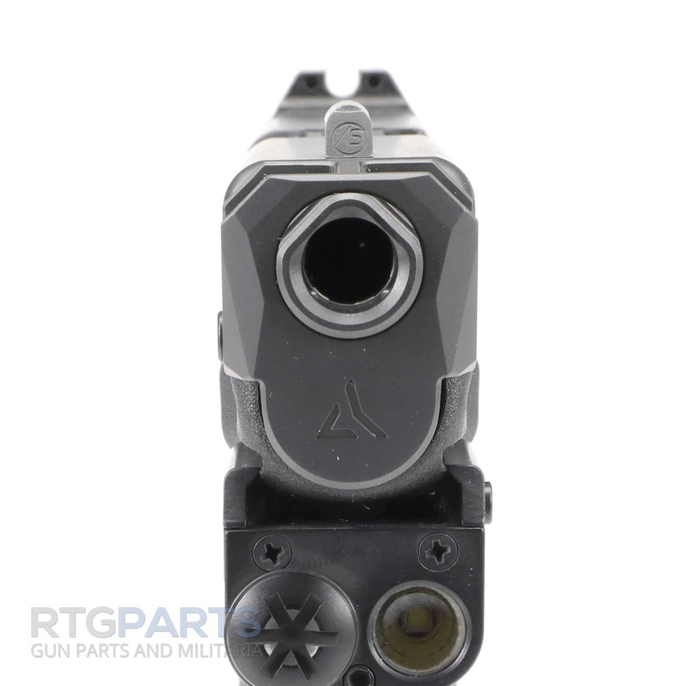The AFTERBURNER compensator is machined from hardened stainless steel and the RAMJET barrel from hardened 416R SS; both are enhanced with a Radianite coating. This combination achieves low friction, high hardness, and high corrosion resistance, making overall durability and erosion from muzzle blast a non-issue. Angled front faces on the AFTERBURNER aid in holstering.
