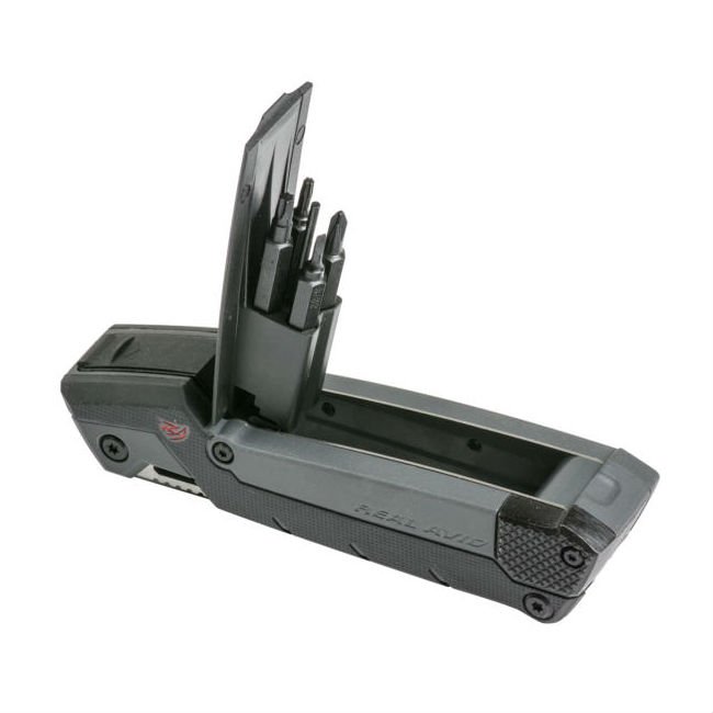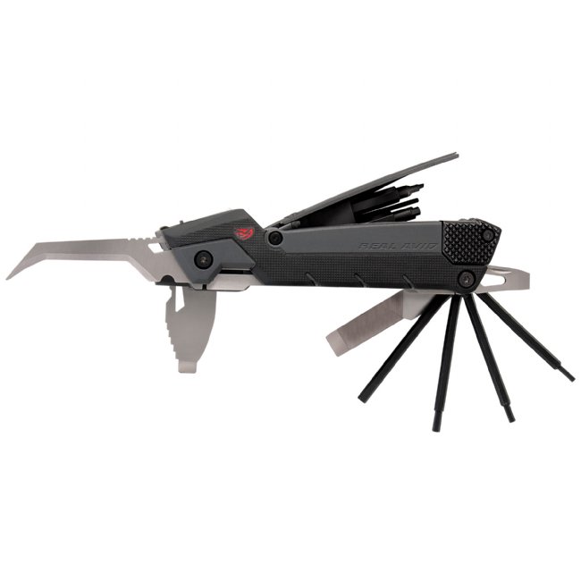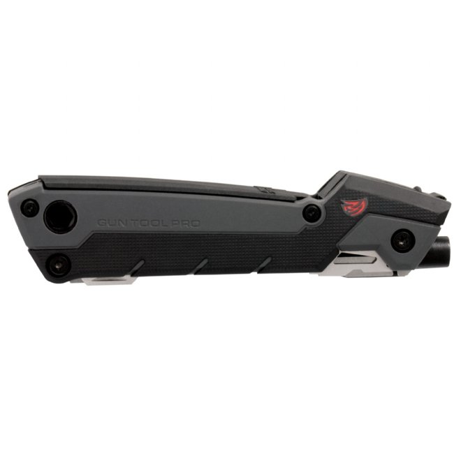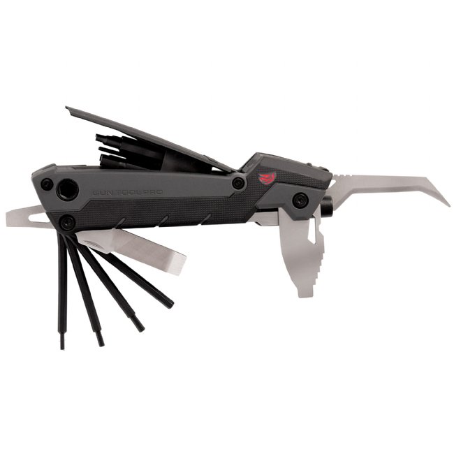 A tool kit that fits in your hand! Real Avid's 'Gun Tool Pro' is made for rifles and shotguns. Gun Tool Pro's rock-solid frame features 30 hard-working tools. Two inch long bits fit into the magnetic 1/4 inch driver and 1/4 inch wrench for extra torque. It features two files, a locking claw mount knife and removable magnetic storage container for holding small screws and pins. It also features a universal choke wrench and tap hammer, all in a sleek design. Gun Tool Pro sets the standard for compact gun tools.