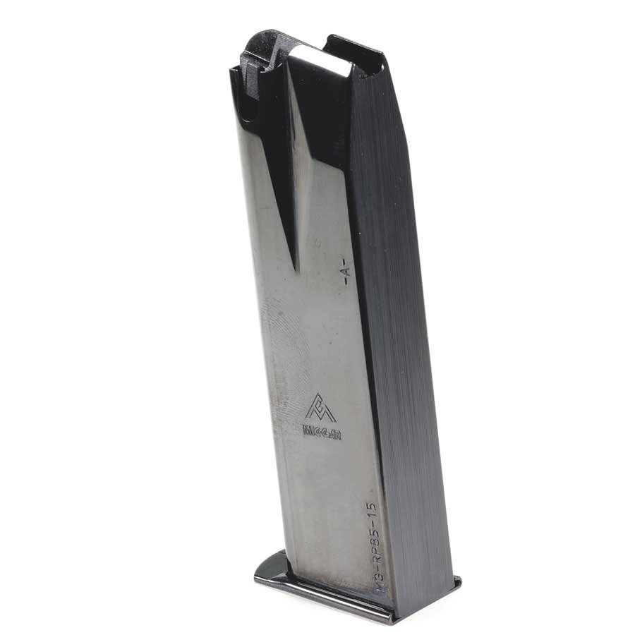 Ruger P85/89/93/94/95 9mm 15 round standard blued magazine, new. Manufactured by Mec-Gar in Italy. Mec-Gar is an OEM magazine manufacturer for dozens of firearms manufacturers.