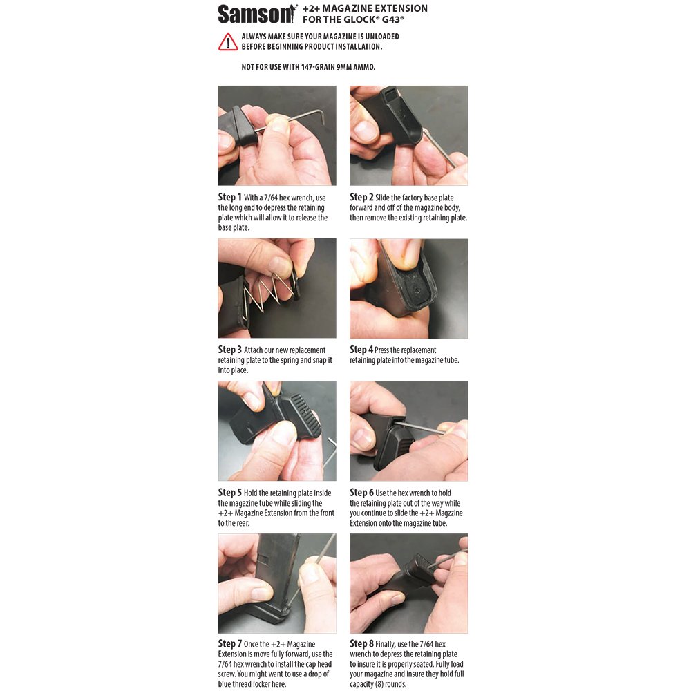 Upgrade your Glock 43 with the Samson Manufacturing +2+ Magazine Extension. It gives you +2 rounds of ammo, + the ability to clear malfunctions and get back on target faster.