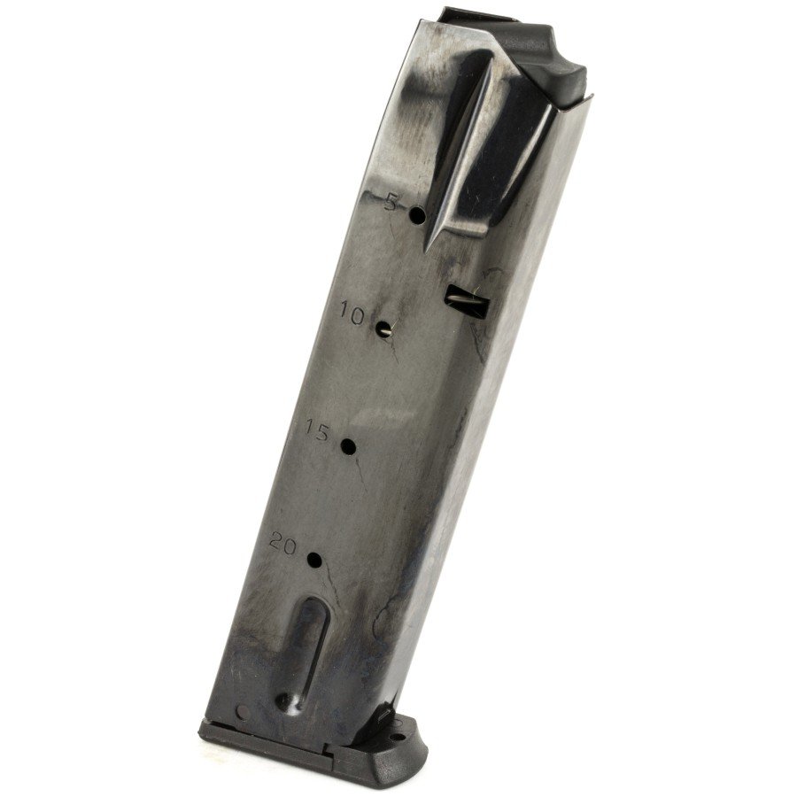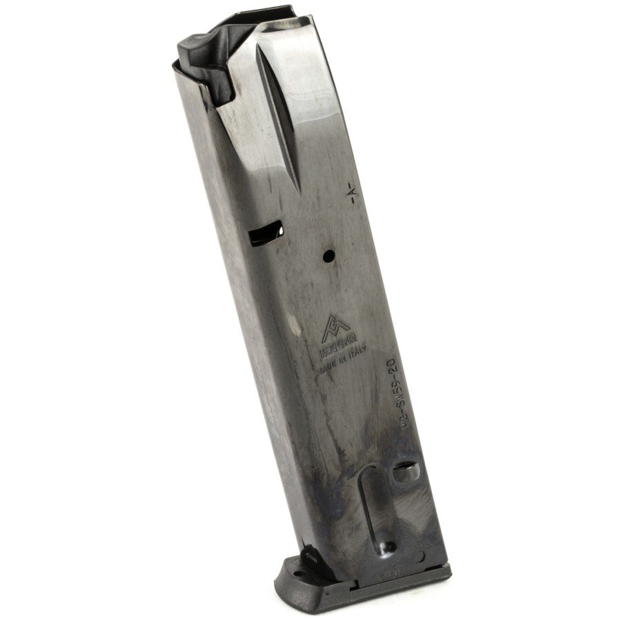Smith & Wesson 5900 Series 915/910/659 20rd blued magazine. Manufactured by Mec-Gar in Italy. You will not find a nicer quality magazine. Mec-Gar is an OEM magazine manufacturer for dozens of firearms manufacturers.