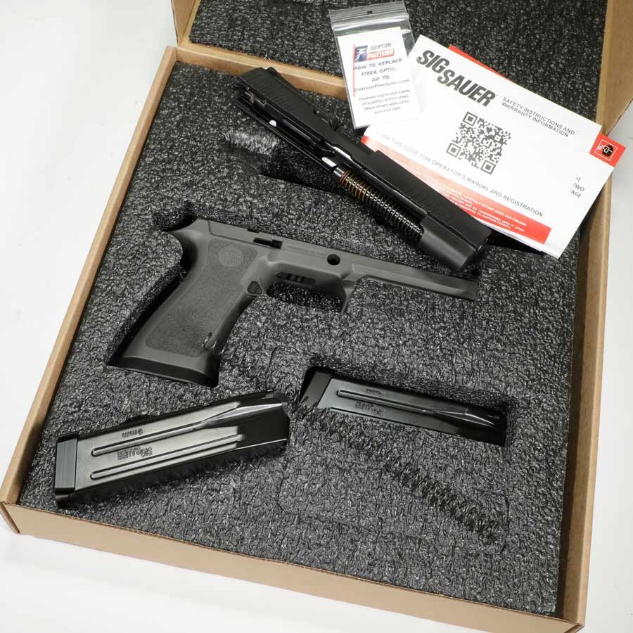 Optimize your P320 Handgun with the P320-X5 Cal-X Kit. It utilizes an innovative TXG tungsten-infused grip module, and a combination of steel and polymer, giving the host weapon weight in all the right places with flexibility - resulting in up to a 50% reduction in muzzle flip. The recoil system uses a solid steel guide rod and a 14lb 1911-style spring, with an additional 12lb spring and (2) 17rd Magazines included. All of these new features coupled with the removable magwell & grip weight, ROMEO1PRO optic-ready slide, 5” bull barrel, and Dawson Precision fiber optic adjustable sights catapults this cal-x kit ahead of the competition and sets a new standard.